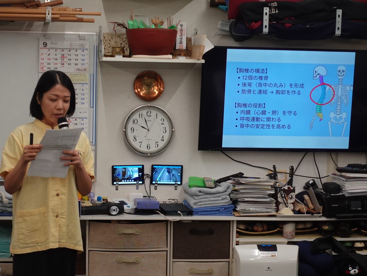■初めて参加させていただきました。当日は背中のコリがひどく痛みがあったのですが、練習を受けた後は骨盤が安定して姿勢が整った感覚で背中も楽になりました。筋肉の繋がりや可動域、筋膜についても説明していただきとても面白く勉強になりました。腰が辛いお客様が多いので早速実践していきたいと思います。また参加したいと思います。ありがとうございました。
